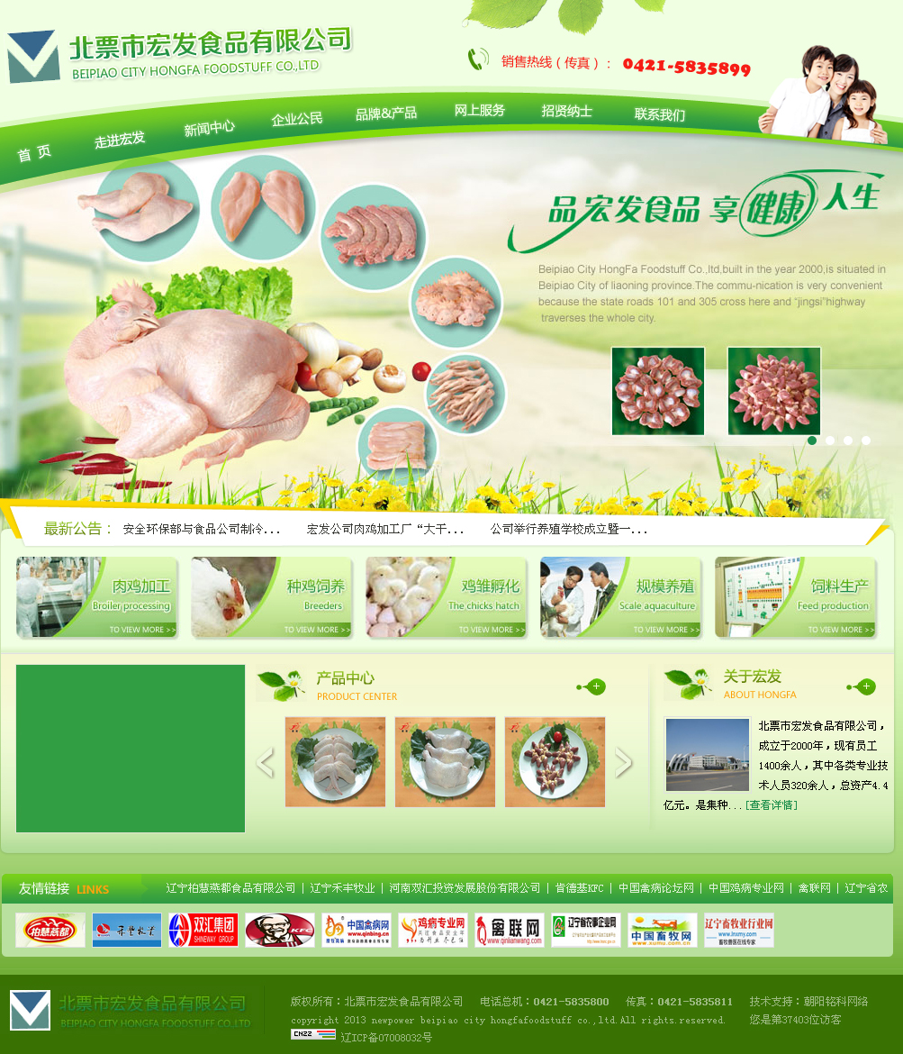 北票市宏發(fā)食品有限公司,成立于2000年,現(xiàn)有員工1400余人,其中各類專業(yè)技術(shù)人員320余人,總資產(chǎn)4.4億元。是集種雞飼養(yǎng)、雞雛孵化、飼料生產(chǎn)、肉雞加工、基地養(yǎng)殖、技術(shù)服務(wù)于一體的農(nóng)業(yè)產(chǎn)業(yè)化國(guó)家重點(diǎn)龍頭企業(yè)、國(guó)家扶貧龍頭企業(yè)。企業(yè)先后通過(guò)了ISO9001質(zhì)量管理體系、ISO22000食品安全管理體系、ISO14001環(huán)境管理體系、GB/T28001職業(yè)健康安全管理體系認(rèn)證。生產(chǎn)的"龍鳥(niǎo)"牌肉雞系列產(chǎn)品先后被國(guó)家和遼寧省評(píng)為:"無(wú)公害農(nóng)產(chǎn)品"、"遼寧省名牌產(chǎn)品","龍鳥(niǎo)"商標(biāo)被評(píng)為"遼寧省著名商標(biāo)",企業(yè)被評(píng)為遼寧省"質(zhì)量管理先進(jìn)單位"、"守合同重信用企業(yè)"、"文明誠(chéng)信單位"等榮譽(yù)稱號(hào)。